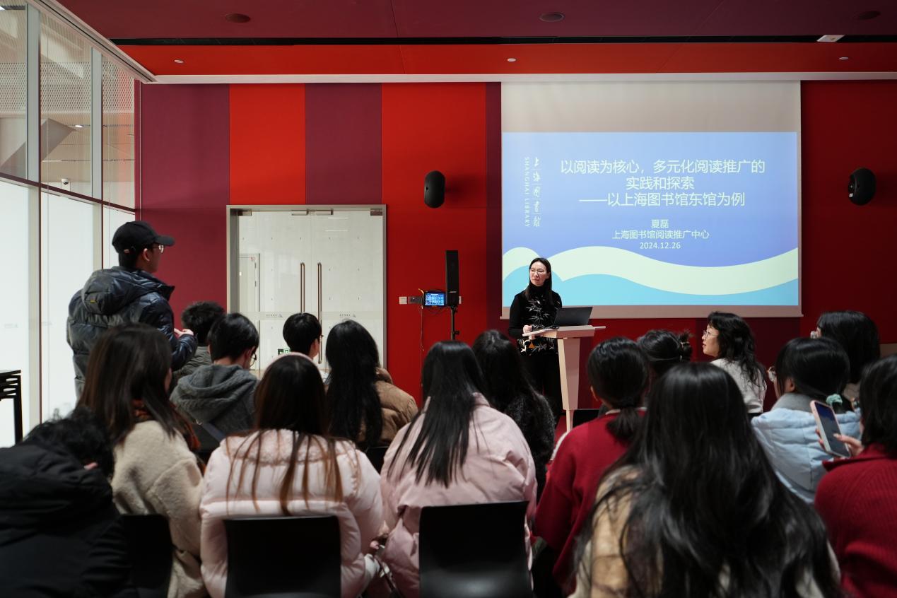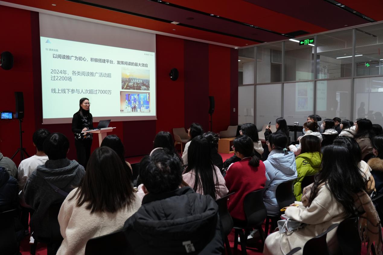 随后,上海图书馆东馆阅读推广中心主任、师大校友夏磊以《以阅读为中心,多元化阅读推广的实践与探索 ——以上海图书馆东馆为例》为主题,分享了在阅读推广方面的实践和探索。夏磊强调,阅读推广已成为公共图书馆的核心服务,东馆以此为核心,积极搭建平台,发挥阅读的最大效应,通过文化、艺术和科学普及推广阅读,稳步推进“大阅读”生态体系的建设。通过一系列活动案例,展示了东馆开馆以来举办的多项阅读推广活动,并分享了这些活动所取得的良好反馈。最后夏磊表示未来要进一步挖掘图书馆的平台效应,以读者需求为导向,发展壮大合作方,并利用好AI赋能阅读推广,践行“人民图书馆”的服务理念。