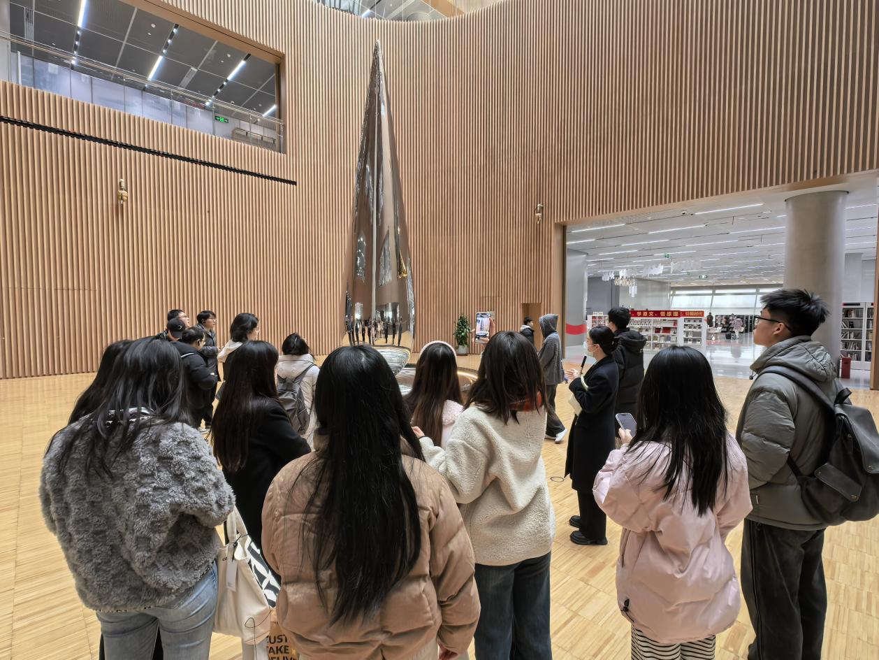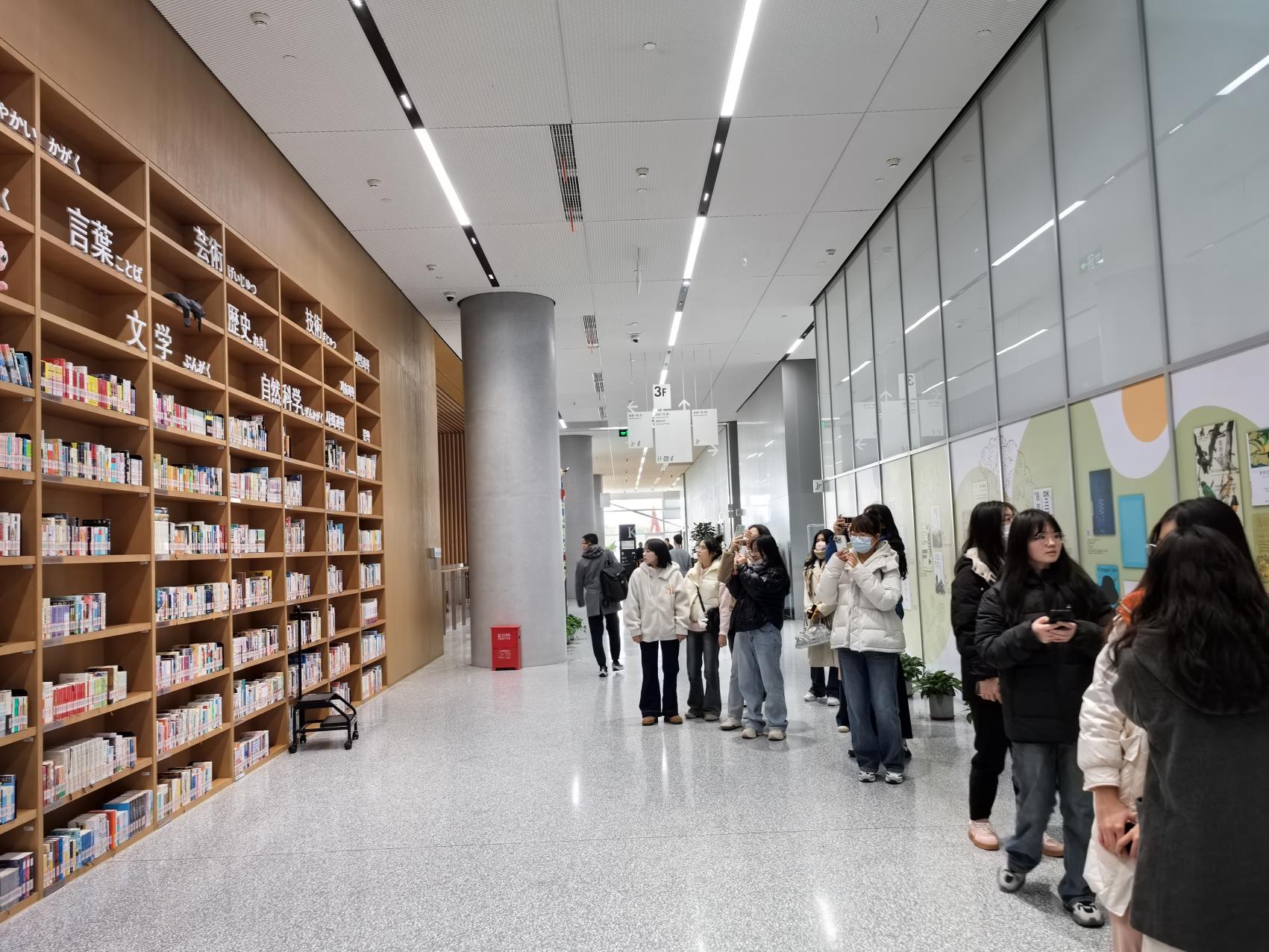 师生们还参观了图书馆的建筑设计和现代技术应用。图书馆的几何形态和玻璃外立面与自然景观相映成趣,馆内陈列的艺术作品,如中庭地面设计和装置艺术,进一步强化了图书馆的文化氛围。此外,师生们还体验了图书馆的智能化设施,包括电子墨水屏层架标和座位预约系统,以及RFID技术的智能书架,这些技术的运用极大地提升了图书馆的服务效率和用户体验。