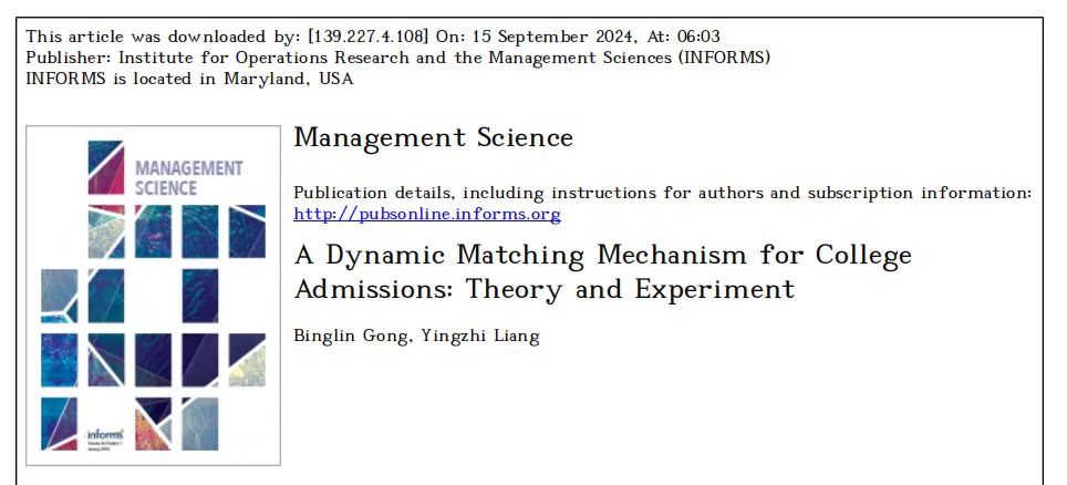 近日,bat365在线体育登录龚冰琳研究员作为第一作者,与合作者关于内蒙古高考招生动态匹配机制的合作论文“A Dynamic College Admission Mechanism in Inner Mongolia: Theory and Experiment”发表于国际公认的经管顶级期刊《Management Science》。