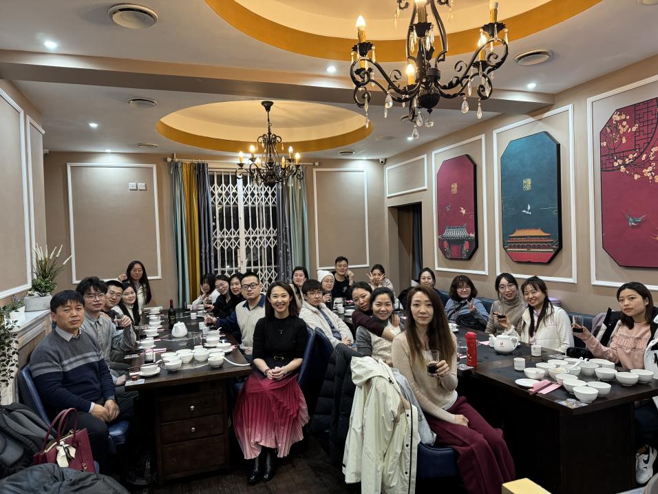 茶话会结束后,利兹大学的Ellen Wang女士亲自带领访学团成员前往“家”餐厅(Home Chinese Restaurant),共度小年夜晚餐。晚餐伊始,Ellen Wang表达了对本次访学项目的高度认可,并特别提到对来自中国的参访人员的亲切感。贾老师也代表同学们向利兹大学商学院的周到安排表示衷心的感谢,并赠送出学院方的官方感谢信,和学生们手绘和启笔的函件。在品尝中国美食的过程中,同学们的友谊与师生情谊进一步升温,整个晚餐现场洋溢着欢乐与温暖的氛围。