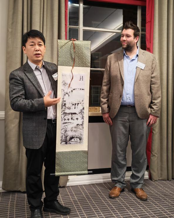 1月17日,在利兹大学商学院的安排下,经管访学师生来到利兹大学University House参加欢迎晚宴,利兹大学商学院邀请了MBA项目授课教授和在读学生一同共进晚餐。饭前,贾利军教授代表华东师大经管学院向利兹大学商学院赠送“印象华师大”的友好礼物,利兹大学商学院MBA项目负责人对访学团的到来表示热烈欢迎,双方师生进行了亲切热情的友好交流。