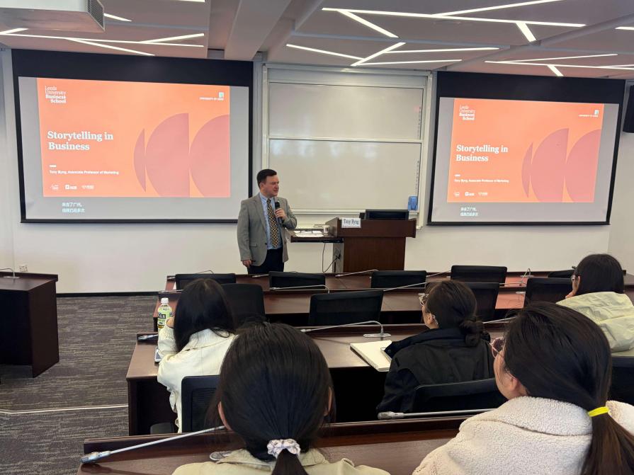 工作会议的间隙,利兹大学商学院市场营销系Tony Byng副教授在小教楼424-426教室作“企业运营国际课堂”系列讲座,主题为“Storytelling in Business(商业中的故事讲述)”。Tony Byng副教授凭借二十余年英国高校教学经验与国际顶尖企业营销咨询背景,深度拆解商业叙事的核心价值,从跨文化共鸣、认知记忆规律、品牌溢价效应等维度,揭示故事讲述在现代商业与品牌传播中的关键作用。现场同步开展英国利兹大学商学院3+1本硕连读项目宣讲。
