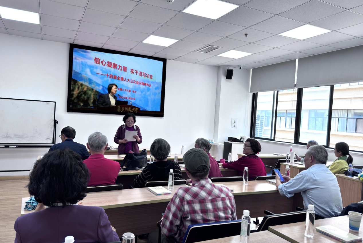 支部党员认真观看聆听了全国人大代表、学校党委书记梅兵向全校离退休干部传达全国两会精神的影像资料。梅兵以《信心凝聚力量  实干谱写华章》为题,详细传达了十四届全国人大三次会议的基本概况,重点解读了两会期间习近平总书记的重要讲话精神,介绍了自己履职和参会体会,讲述了热点议题及其背后的故事。党员同志纷纷表示,梅兵书记报告内容丰富详实、重点突出,提振信心、深受鼓舞。我们要认真学习全国两会精神和习总书记在两会期间的系列重要讲话精神,把握核心要义、加深理解体悟,把思想和行动统一到党中央对发展新质生产力、对进一步全面深化改革、对教育事业发展等重要部署上,为教育强国建设贡献智慧和力量。