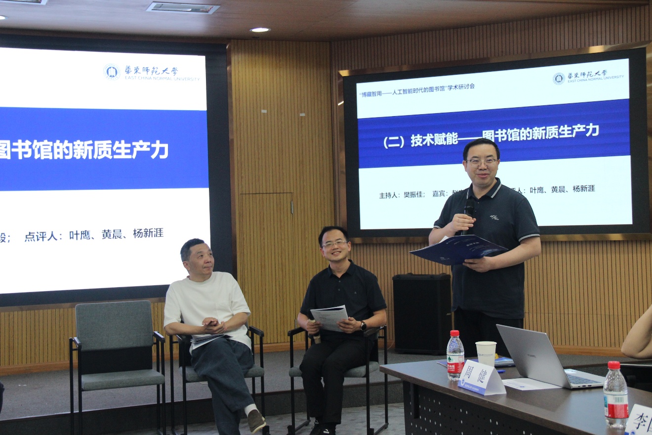 “技术赋能——图书馆的新质生产力”主题的青年学者报告和研讨由南开大学商学院党委副书记、信息资源管理系主任樊振佳主持。南京大学信息管理学院教授赵宇翔聚焦“生成式人工智能驱动下智慧图书馆信息搜索与提示素养培育”,主要讨论了检索、数字素养、提示素养与对话式搜索四大方面。华东师范大学图书馆数据与技术中心主任张毅介绍“智慧涌现服务再造:AI赋能的图书馆新质生产力探索与实践”,针对AI新质生产力与图书馆的战略机遇、AI重塑图书馆核心能力的多元实践、图书馆作为AI枢纽赋能教学科研的生态化整合框架等方面进行深入论述。叶鹰、黄晨、杨新涯针对上述两位研究者的汇报进行点评,对于新一代信息搜索模式、AI素养教育、提示素养、未来教育、数字资源整序、构建中央知识库等问题开展激烈讨论。