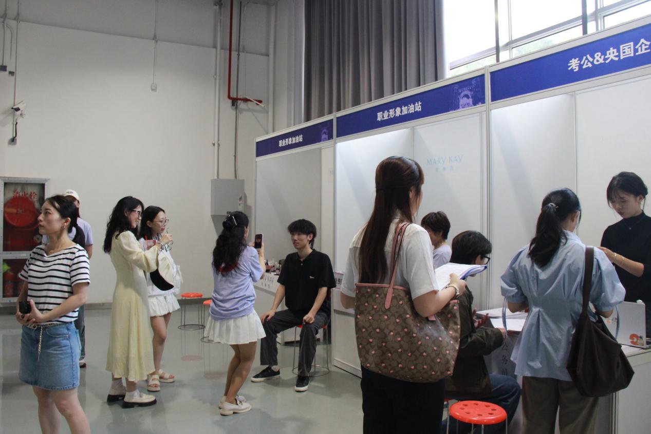 为了更好地实现全学段生涯指导,本次招聘会上还设置了“生涯驿站”,从简历修改、考公&央国企咨询和职业形象等方面给各学段的同学提供指导和服务。邀请了学校学生职业发展中心就业服务部主管李铮、猎聘网简历优化顾问俞亚莉和前程无忧、拉勾网职场导师张小曼,结合同学们的求职方向给予简历优化建议和生涯规划指导。高顿教育讲师为有志于考公和央国企的同学们提供专业化咨询。玫琳凯的形象设计师为同学们的职场形象管理现场示范教学。