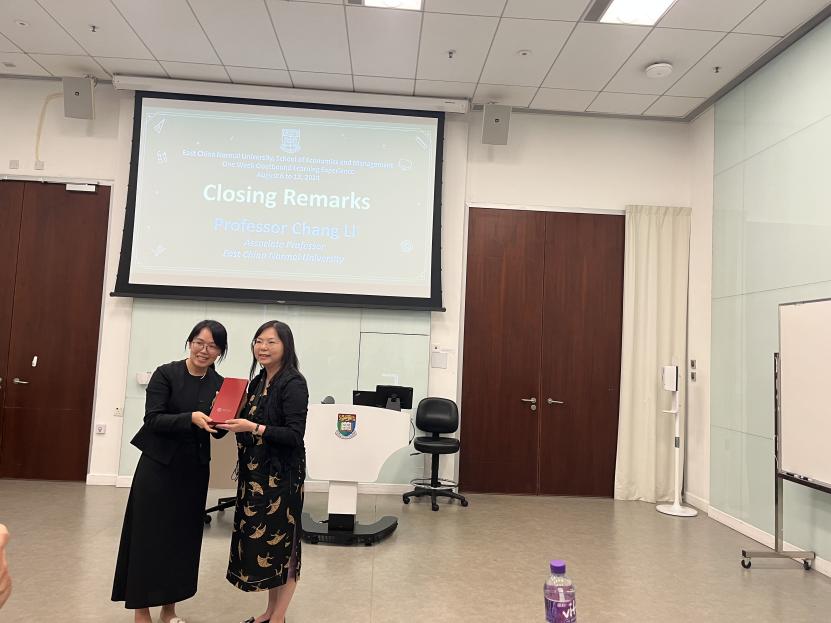 8月11日的结业仪式上,由bat365在线体育登录李嫦副教授代表学院,对本次港大研学活动发布感谢致辞,她提出,本次学院与港大主办方首届合作研学项目的顺利落地,离不开港大内地事务处各位老师的悉心筹备的校内讲座和校外企业参访,她对此表示感谢,并期待华东师范大学与香港大学未来会有更多的交流机会。随后,李嫦副教授代表经管学院,向港大经管学院副院长梁硕玲教授赠送ECNU文创纪念品并合影留念。