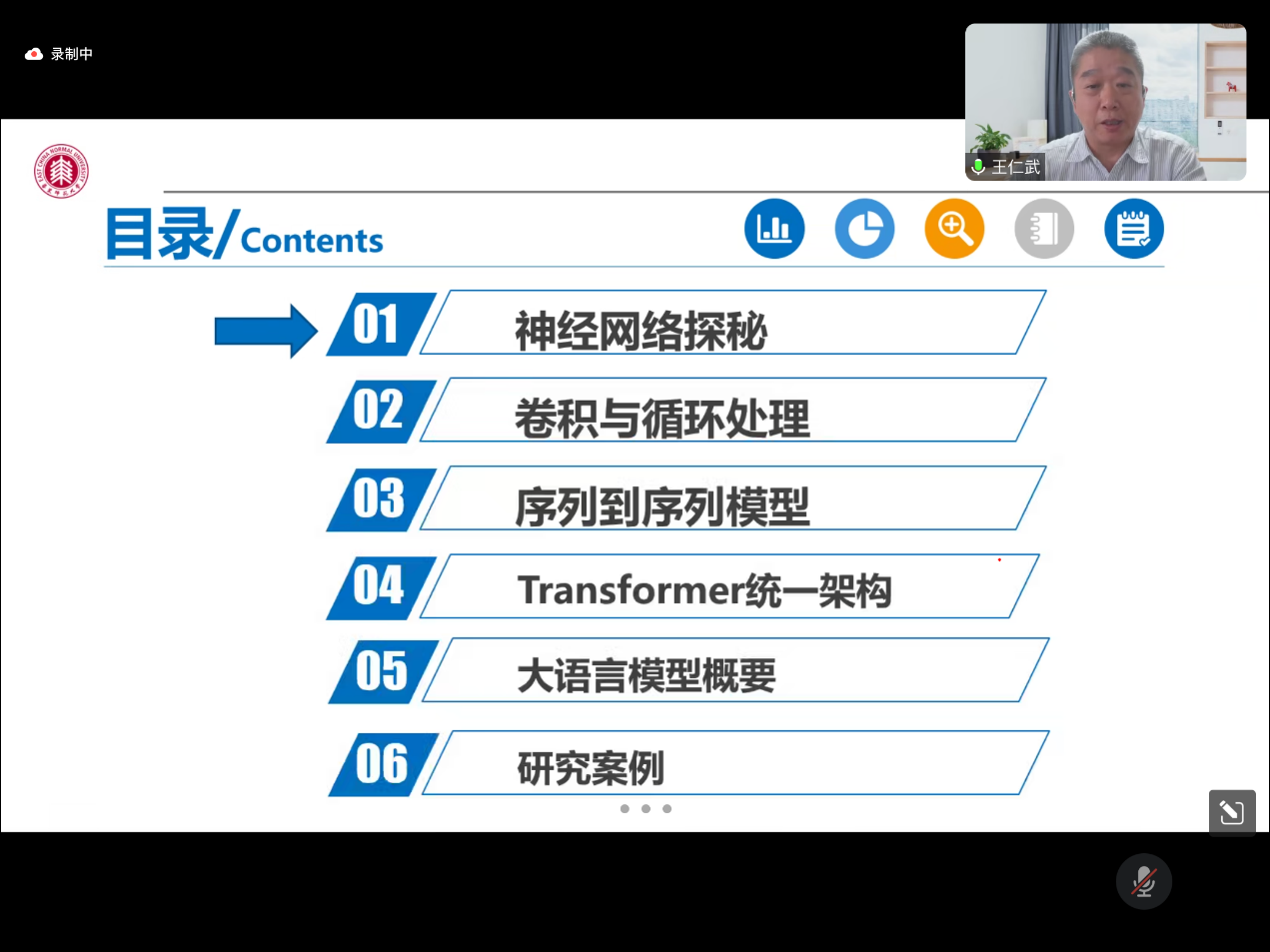 此次讲座中,王仁武老师主要对神经网络、卷积与循环处理、序列到序列模型、Transformer统一架构、大语言模型概要、以及研究和应用案例等内容进行讲解,循序渐进地带领老师和同学了解从神经网络到大语言模型的发展轨迹。