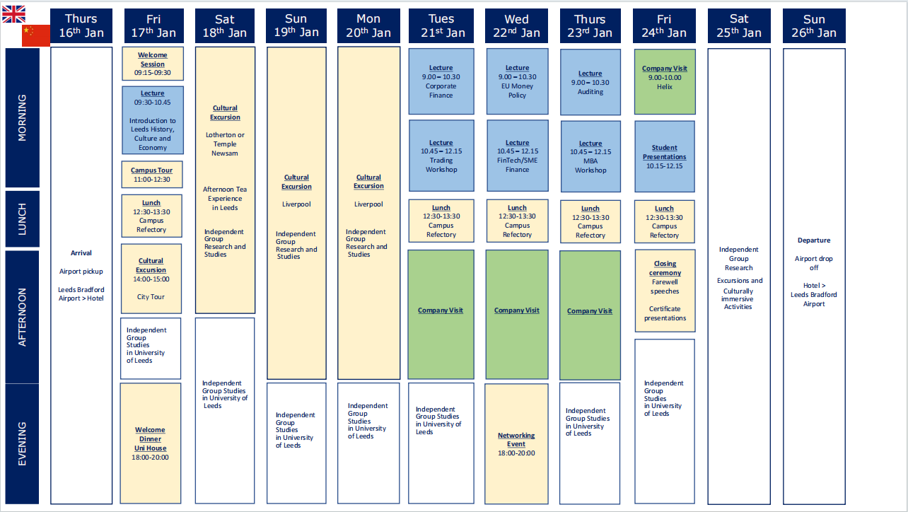 项目学生将在利兹大学校区内参加为期8天的主题访学课程、企业参访与文化游览活动,相关学术课程/讲座涵盖公司金融、国际贸易工作坊(提供伦敦证交所交易模拟实操软件)、欧盟货币政策、MBA工作坊、金融科技、国际审计等主题,学生还将实地考察当地特色制造工厂/金融/证券相关机构/单位,对话行业经理人或企业高管,以及领略利兹、利物浦、约克郡、曼彻斯特或伦敦等城市风光,与利兹大学当地学生/校友座谈交流,并开展小组独立文化研究。