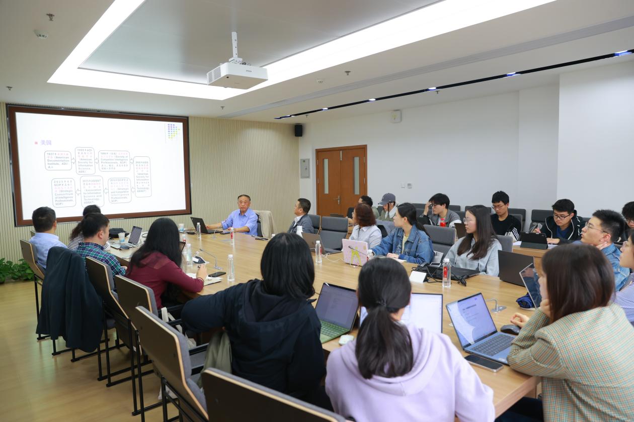 讲座伊始,王知津对中国科技情报事业建设与发展的历史、学科体系,以及情报学概念的内涵与外沿进行了详细介绍。王知津指出,学科体系是一种知识体系,是学科要实现的目标,是在相对稳定和变动的有机统一中实现的辩证发展,可以从宏观、微观两个层面来深入理解。其次,王知津以国际文献联合会(FID)、美国情报学、俄罗斯情报学、中国情报学为例,梳理了世界各地情报学的演变过程,并从情报学的“耳目、尖兵、参谋”作用出发,详细讲解了情报工作的重点与核心。